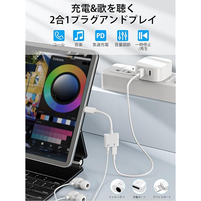 iPhone イヤホン変換アダプタ 2in1 Lightning to 3.5mm ヘッドフォンジャック - 充電しながら音楽再生、16bit/48KHz Hi-Fi 音質、iPhone 14/13/12/11/XS MAX/XS/X/8/7/8plus(iOS11-18対応)