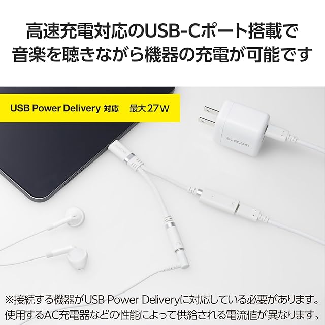 充電専用のUSB Type-CポートにAC充電器を接続することで、充電しながら音楽・動画視聴や通話が可能です。