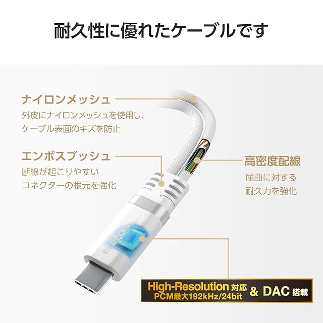 充電しながら音楽・動画視聴ができる。スマートフォンやタブレットなどのUSB Type-C(TM)ポートをφ3.5mmステレオミニジャックとUSB Type-Cポートの2つに変換。ハイレゾ対応音声変換ケーブルです。