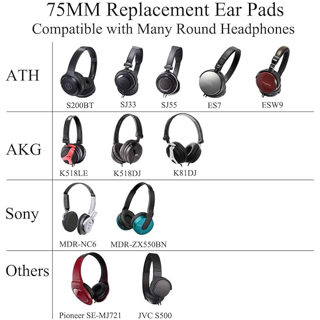 【普遍的な互換性】以下に限定されない75MMの丸型ヘッドホンと互換性があります:オーディオテクニカATH-S200BT / SJ3 / SJ33 / SJ5 / SJ55 / ES7 / ESW9 / ESW 10;ソニーMDR-NC6 / MDR-ZX550BN; AKG K518 / K518DJ / K518LE / K81 / K130;パイオニアSE-MJ721; JVC S500 / HA-NC80など