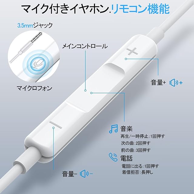【リモコン簡単操作·クリアな通話】ケーブルにはリモコンとマイクを搭載。イヤホンのリモコンとマイクボタンで、ハンズフリー通話やスマートフォンの音楽再生などを簡単操作できます。音楽再生中に、画面を見ずにボリュームをコントロールしたり、次の曲に飛ばしたりすることも簡単です。そのまま電話がかかってきても、いちいちスマホを出さずにコントロールできます。相手の声も聞き取りやすく、仕事(オンライン会議・テレワーク)接続してWeb会議にも最適です。