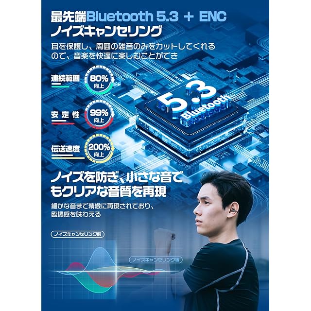【最先端Bluetooth5.3&Hi-Fi高音質&高品質な通話】業界最先端レベルBluetooth 5.3+EDRを採用し、通信速度、通信距離、安定性が飛躍的に向上になります。同時に、消費電力をより低く、データ転送はより速く、干渉防止性能がより強くなりました。「ゼロ」に近い遅延率を実現します!内蔵の高音質オーディオチップが音楽の細部まで捉え、鮮明な高音と適度な低音のある豊かなサウンドを実現します。高い通話品質も魅力の1つであり、デュアルビームフォーミングマイクが声を正確に捉え、デジタルプロセッサが周囲の音や風切音をカット。クリアで聞き取りやすい音声を届けます。通話用MEMSマイクが2基備わっており、デュアルマイクノイズキャンセリング技術を採用します。加えて、周囲のノイズと話し声を判別するAI技術の活用により、クリアな音声を相手に届けることが可能です。通話やリモート会議といったシーンに重宝します。