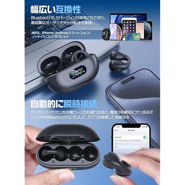 【2024年高性能モデル イヤーカフ イヤホン&至上の体験】2024年間より装着感やより音質、使い勝手が提供へのお客様を目指して開発した、弊社が完全ワイヤレス骨伝導イヤホン「C7」を開発しました。従来の装着方法との違いは、イヤホン本体は新形状U字デザインを採用し、片耳重量はわずか約4gで、お客様に究極の快適さを提供して、より耳を守ることができます。優れた音漏れ保護機能を備え、音楽の世界にどっぷり浸かることができます。非常に高級感あるデザイン、光沢感のある上質な色合いが、スーツなどのフォーマルな服装にもマッチします。 ファッショナブルなデザインスタイルは若者からご年配の方まで絶大な人気を誇り、ご親戚やご友人への贈り物としても大変おすすめです。