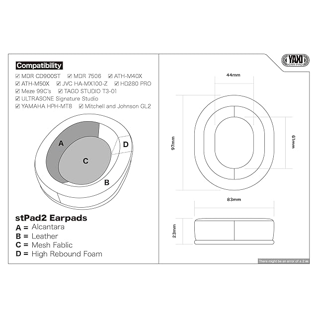 本製品は複数人で使用する環境下であるスタジオ、その他現場を想定して抗菌物質を加えた抗菌レザーを採用。ウレタンは反射の起きやすいドーム状に加工し、より聴きやすい音を提案。内径部分は音の反射量を考慮し、前:レザー、後:アルカンターラとそれぞれ素材を使い分け、前方に音の広がりを持たせ、スピーカーからの音を聞いているような比較的自然な鳴り方を目的とします。装着具合はドライバとの距離を固定し、耳全体を覆いかぶせるため快適なリスニングが可能。まるで耳を小さなドーム状オーディオルームに置いたかのようなイヤーパッドそれがstPad2です。 Best fit MDR-CD900st / 7506 /CD700 / V6 交換可能機種 Audio Technica ATH-msr7 / M20X / M30X / M40X / M50X/ WS1100 / PRO5MK3 / DSR7BT / SR9 / DSR9BT Pioneer SE-MSST-K / HRM—6 PRO SOUNDWARRIOR SW-HP10 / HP11 / HP20 SENNHEISER HD280 PRO MK2 TAGO STUDIO TAKASAKI T3-01 JVC HA-MX100-Z / MX10-B / CLASS-S WOOD HA-SW01 / SW02 maxell MXH-MD5000 YAMAHA HPH-MT8 / MT120 ULTRASONE Signature Studio / DJ / HFI-580 beyer dynamic DJ250/80