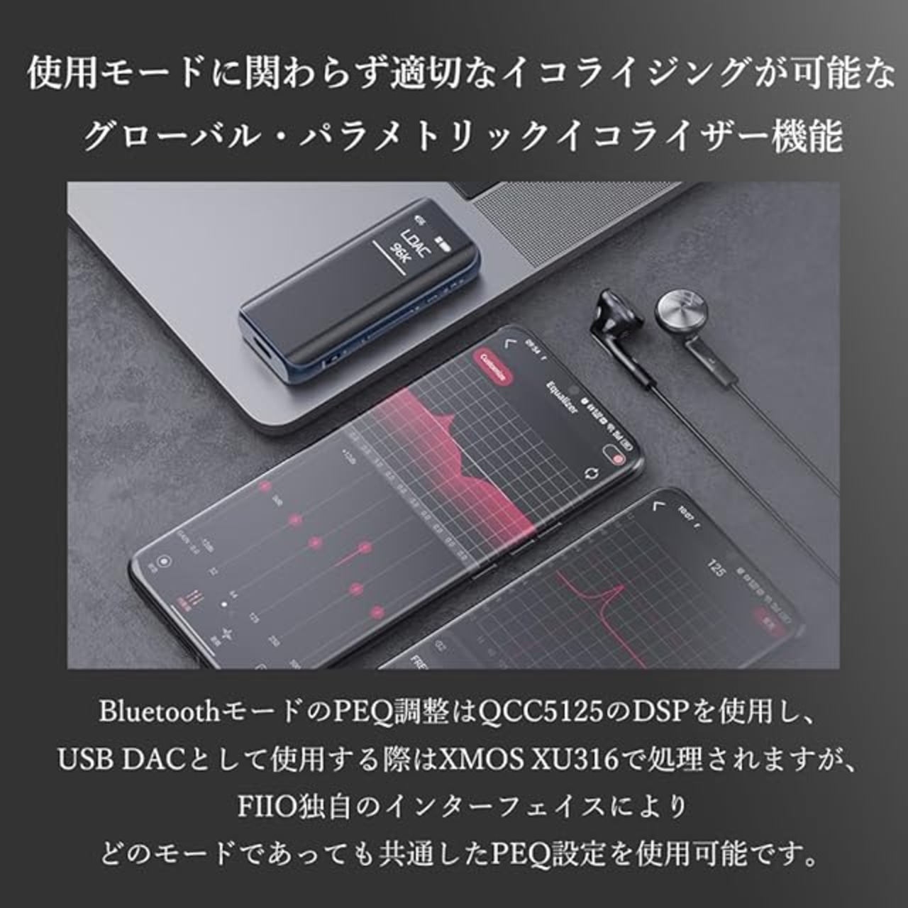 使用モードに関わらず適切なイコライジングが可能なグローバル・パラメトリックイコライザー機能:BTR15には、FIIOが独自に開発した、無線・有線どちらのモードでも正確にイコライジングを設定可能な「グローバル・パラメトリックイコライザー(PEQ)機能」を搭載しています。 BluetoothモードのPEQ調整はQCC5125のDSPを使用し、USB DACとして使用する際はXMOS XU316で処理されますが、FIIO独自のインターフェイスによりどのモードであっても共通したPEQ設定を使用可能です。 ※USB DACとして使用時にPEQの有効/無効を切り替えるとUSB接続がリセットされます。再度、スマートフォン側のボリューム調整と再生操作を行なってください。