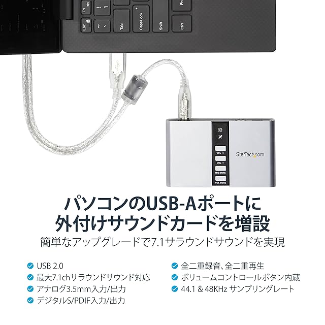 PCのサウンドをアップグレード:ステレオ - 7.1chオーディオ用途でアナログ・デジタル音声出力に対応。デスクトップ/ノートPCに搭載のオーディオ機能をアップグレードできるバスパワーUSBアダプター。1m USBケーブル付属