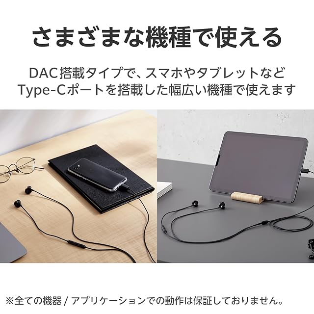 DAC搭載タイプで、スマートフォンやタブレットなど幅広い機種で使用できます。