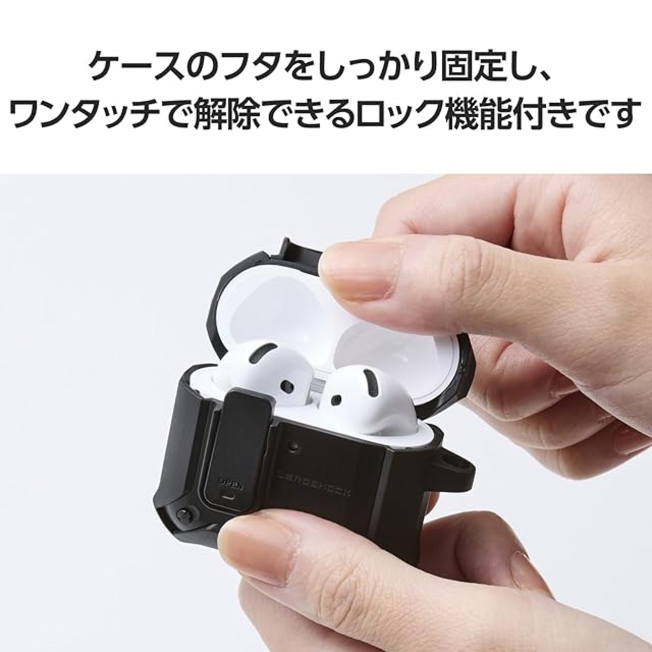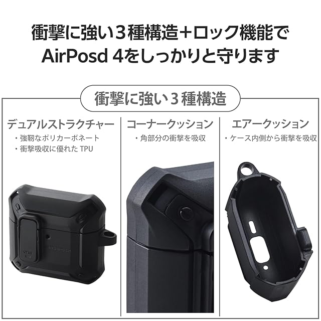 落下時に本体の飛び出しを防ぐロック機能付き!3つの衝撃吸収構造で衝撃から守るAirPods (第4世代)用ZEROSHOCK Lockケースです。