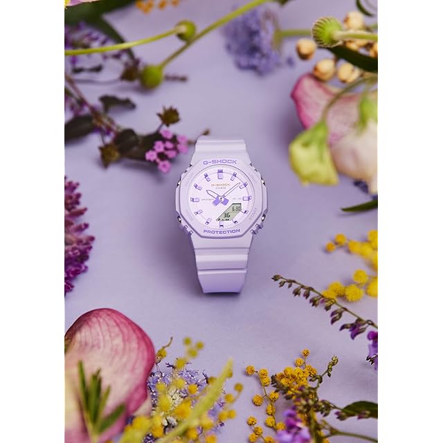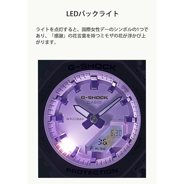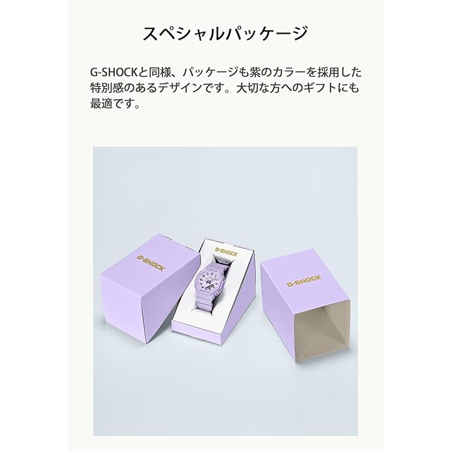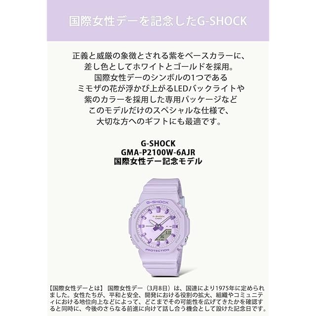 レディース向けG-SHOCK: 3月8日の国際女性デーを記念したG-SHOCKのご紹介です。本モデルは、正義と威厳の象徴とされる紫をベースカラーに採用し、随所にホワイトとゴールドのアクセントカラーを施しております。
