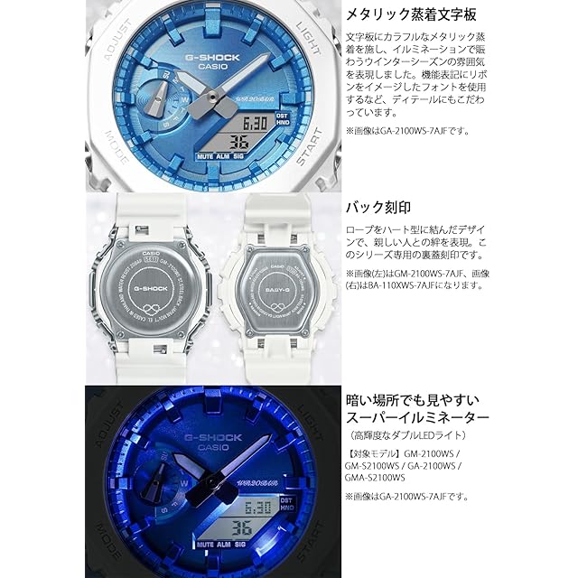 レディース向けG-SHOCK: 冬限定の「プレシャスハートセレクション」より、「冬の煌めき」をカラーテーマに採用したモデルです。今年のプレシャスハートセレクションは、「多様性」をテーマに、好きな色、サイズ、デザインから選ぶ楽しさを味わえる6モデルのラインアップとなっております。