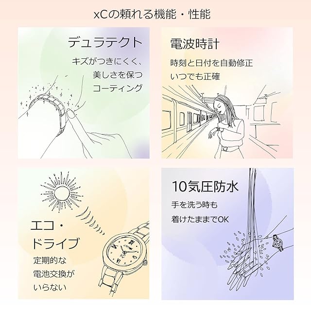 【上品で凛としたデザインと使いやすい機能】クロスシーは、洗練されたデザインと優れた機能性を兼ね備えた時計です。シンプルながら華やかなデザインで、オンオフを選ばずアクセサリーのように腕元を彩ります。
