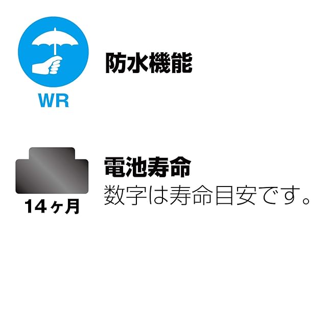 駆動時間:新しい電池を入れた場合、約14ヵ月(お買い上げの時計に組み込まれている電池は、時計の機能や性能をチェックするために組み込んであるモニター用電池です)