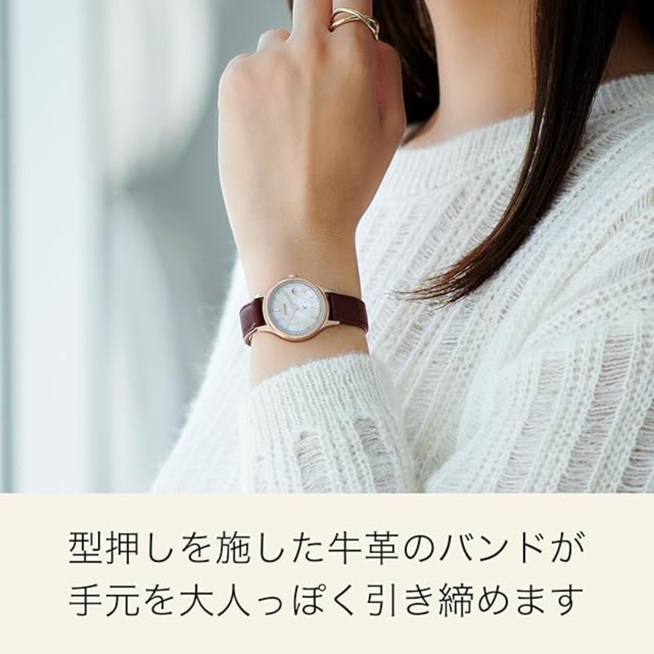 【サクラピンクのケースと白蝶貝の革バンドモデル】上品でフェミニンな「hikari collection」は、”光の環”をイメージした艶やかなベゼルが特徴。文字板には白蝶貝を採用し、12時・6時・9時位置に配置した差し込む光をイメージしたカットパーツなど、美しくさりげない輝きが手元を彩ります。型押しを施した牛革のバンドは、お手元を上品に引き締めます。