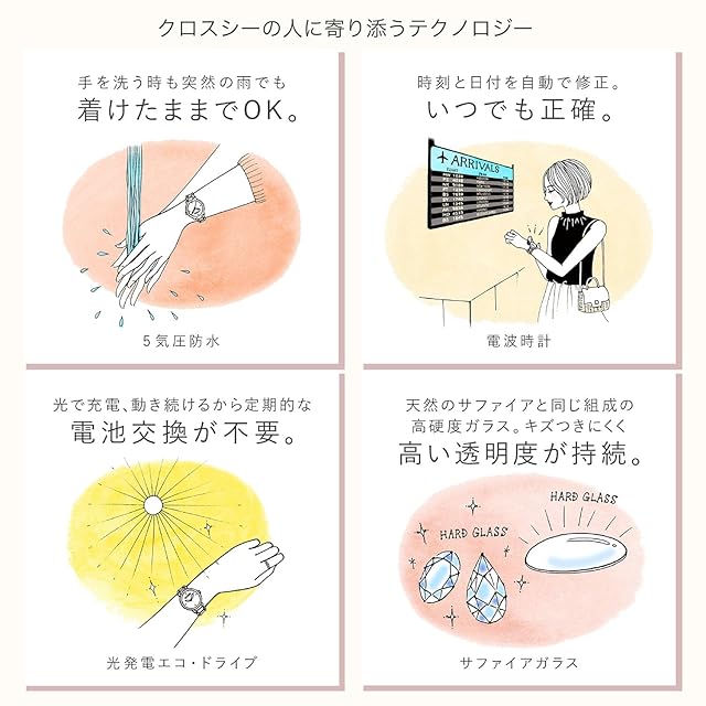 【頼れる機能・性能】定期的な電池交換不要のシチズン独自技術の光発電エコ・ドライブ搭載で手間いらず。どこにいても正確な時刻に同期するワールドタイム電波時計。水仕事にも安心な5気圧防水。便利な日付、夜光つき(針)。※操作方法は、メーカーウェブサイトの取扱説明書から確認することもできます(機種番号:H060)。