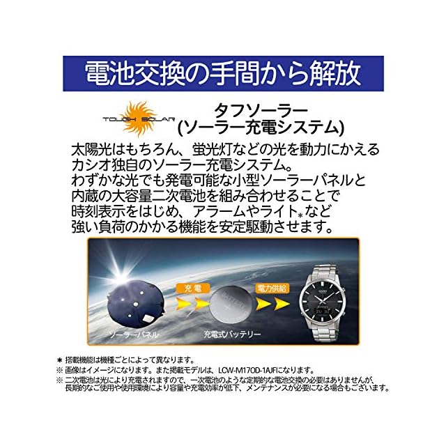 【タフソーラー】わずかな光でも発電するソーラーパネルと大容量の二次電池を組み合わせる事で強負荷のかかる様々な機能を安定稼働させるカシオ独自のソーラー充電システム