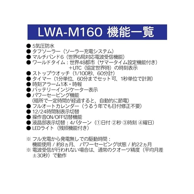 正確な時を刻むソーラー電波時計wave ceptorから、日本2局、中国、アメリカ、イギリス・ドイツの標準電波に対応したマルチバンド6を搭載するLWA-M160シリーズのご紹介です。