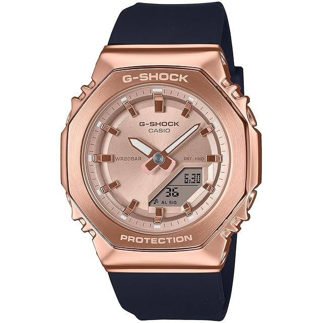 レディース向けG-SHOCK: 八角形フォルムのメタルカバードシリーズGM-S2110から、ピンクゴールド×ブラックのカラーモデルのご紹介です。