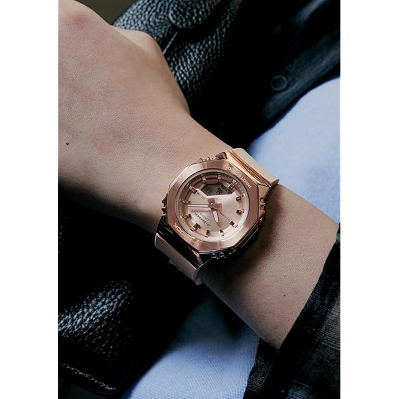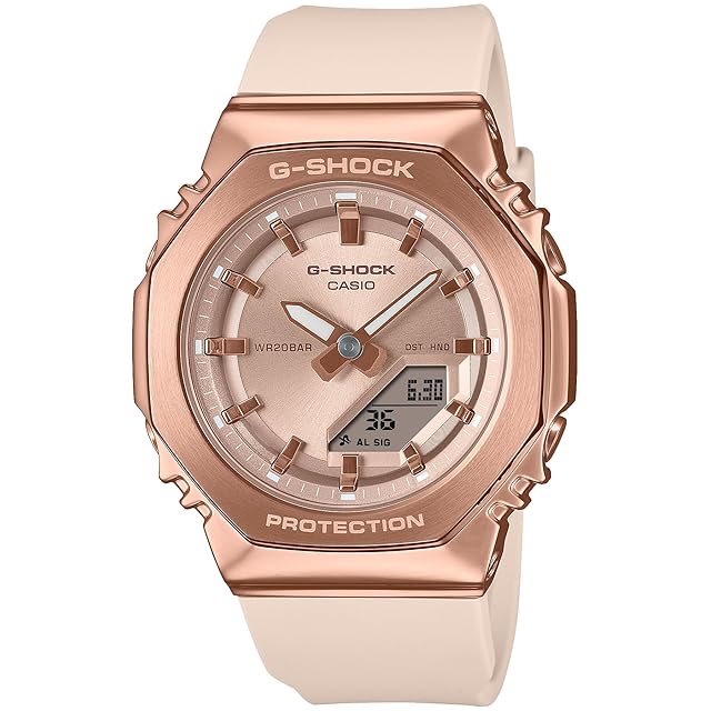 レディース向けG-SHOCK: 八角形フォルムのメタルカバードシリーズGM-S2110から、ピンクゴールド×ピンクのカラーモデルのご紹介です。