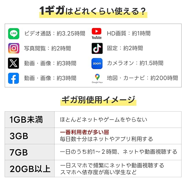 【ギガ容量】日本国内では毎月3GBまで、海外は毎月1GBまで高速通信がご利用可能。超過後も200Kbpsで使い放題!毎月の高速ギガ容量を超過後200Kbpsに低速化されますが、翌月1日に通信速度が通常に戻ります。