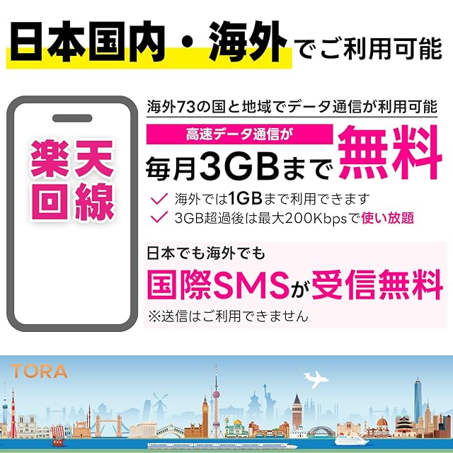 【SMS受信機能付き】LINEやInstagramやUber Eats等SMS認証が必要なアプリを簡単に登録することが可能!</br> 【SMSの利用】日本でも海外(73ヵ国)でもSMSが制限無しで受信可能。送信機能は付きません。</br> 【楽天回線】あんしんの楽天モバイル回線の高速データ通信(5G/4G)がご利用いただけます。</br> 【ギガ容量】日本国内では毎月3GBまで、海外は毎月1GBまで高速通信がご利用可能。超過後も200Kbpsで使い放題!</br> 【SIMサイズ】マルチカットSIMで、nanoSIM / microSIM / 標準SIM に対応しております。</br> 【かんたん利用】開通手続き、契約手続き、本人確認など一切不要!SIMカード装着で即利用可能!</br> 【APN設定不要】楽天回線に対応する端末はAPN情報自動で認識されます。</br> 【iPhone対応】iOSバージョン14.5以降で、iPhone 6S~16ProMaxに対応しています。</br> 【Android対応】Android OSバージョン10以降でご利用いただけます。</br> 【利用期間】初回通信月(初月無料特典付き)+12ヵ月(1年間)、最長13ヵ月間ご利用可能です。</br> 【有効期限】購入日からではなく、初回通信月(初月無料)から利用開始できますので、最大13カ月をむだなく利用可能!</br> 【延長利用】利用期間の延長を希望する方は、利用期限が切れる前(2か月前)までにご連絡ください。</br> 注意事項:本SIMカードでは音声通話機能はご利用いただけません。</br> 注意事項:本商品は、SIMロックフリー端末でご利用いただけます。詳しくは楽天公式サイトでもご確認可能です。</br> 注意事項:毎月の高速ギガ容量を超過後200Kbpsに低速化されますが、翌月1日に通信速度が通常に戻ります。</br> 注意事項:本SIMの開通期限(初回通信)は、購入日より60日以内となります。</br>