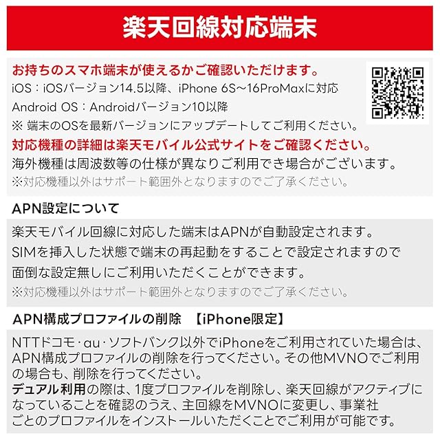 【APN設定不要】楽天回線に対応する端末はAPN情報自動で認識されます。iOSバージョン14.5以降で、iPhone 6S~16ProMaxに対応しています。Android OSバージョン10以降でご利用いただけます。
