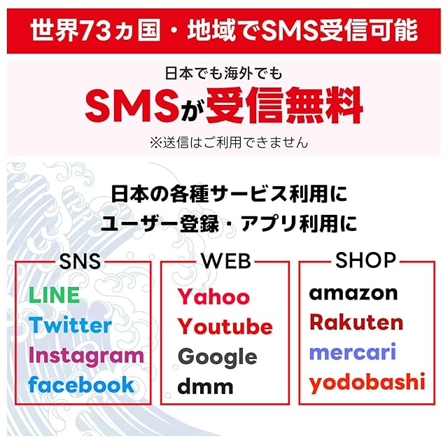 【SMS受信機能付き】LINEやInstagramやUber Eats等SMS認証が必要なアプリを簡単に登録することが可能!日本でも海外(73ヵ国)でもSMSが制限無しで受信可能。送信機能は付きません。