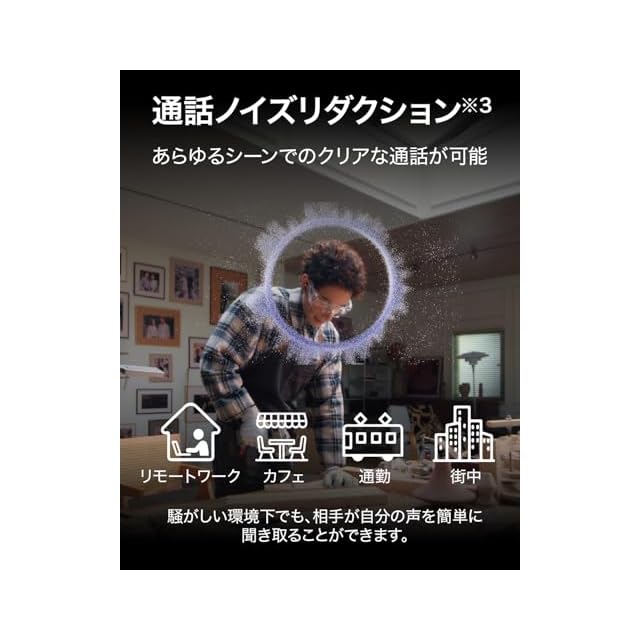 【ワンランク上の通話体験】トリプルマイクに加えて、新たに骨伝導VPUセンサーを搭載することにより、通話ノイズリダクションがさらに進化。ディープニューラルネットワーク(DNN)アルゴリズムと指向性マイクで、AIが周囲の雑音とあなたの声を切り分けることを学習します。周囲の雑音が気になるカフェや電車のホーム、スタジアム、屋外など騒がしい環境下で通話をしていても、相手には安定したクリアではっきりとした声が届きます。