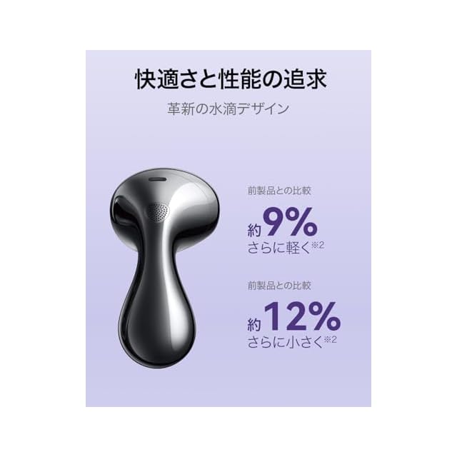 【目を引く水滴デザインの着用感がさらに向上】水滴を連想させる美しさで、近未来感のあるユニークな形状です。前モデルからイヤホン本体が約9%軽く、約12%小さくなり、長時間でもより快適にご使用いただけるようになりました。人間工学に基づいて約1万回のシミュレーションを経て設計されたインナーイヤー型イヤホンとなっていますので、耳栓のようなカナル型の着用感が苦手な方も快適にご使用いただけます。さらに付属のイヤーチップを使えば、フィット感の調整も可能です。