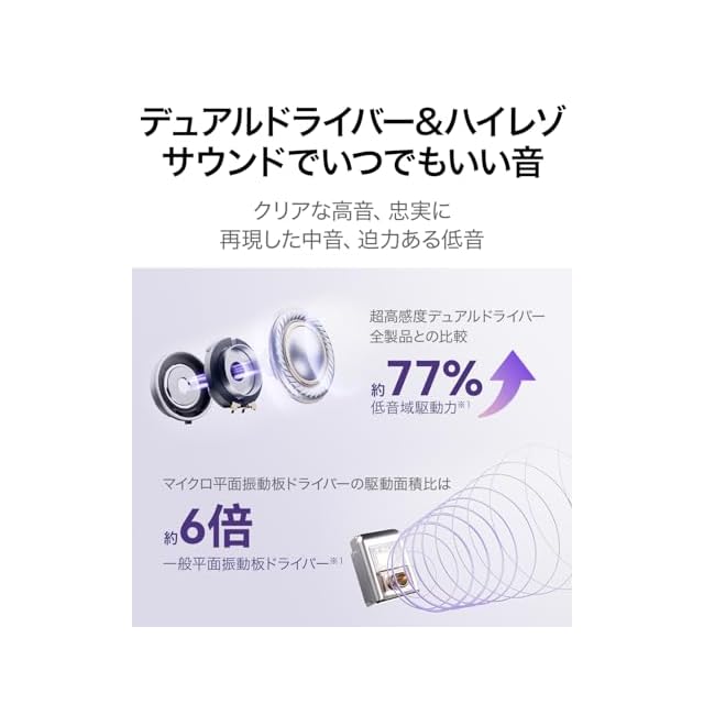 【フラッグシップレベルの音質へと進化】ダイナミックドライバーユニットに、独自開発のマイクロ平面振動板ドライバーユニットも加わり、幅広い再生周波数帯域を実現。迫力のある低音に加え、音楽をより解像度高く再現することができます。さらに、低音域の11mmのデュアルマグネットダイナミックドライバーを改良し低音域駆動力も向上。SBC、AAC、LDACに対応し、ハイレゾ認証を取得しています。