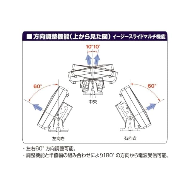 左右60°方向調整が可能で、調整機能とアンテナ性能の半値幅の組み合せにより180°方向からの電波受信も可能です。