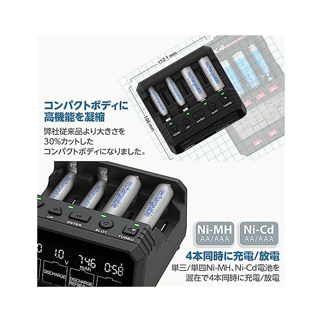 [設定可能項目]充電電流、充電停止電圧、デルタピーク感度、ターボ充電、トリクル、放電電流、放電終了電圧。