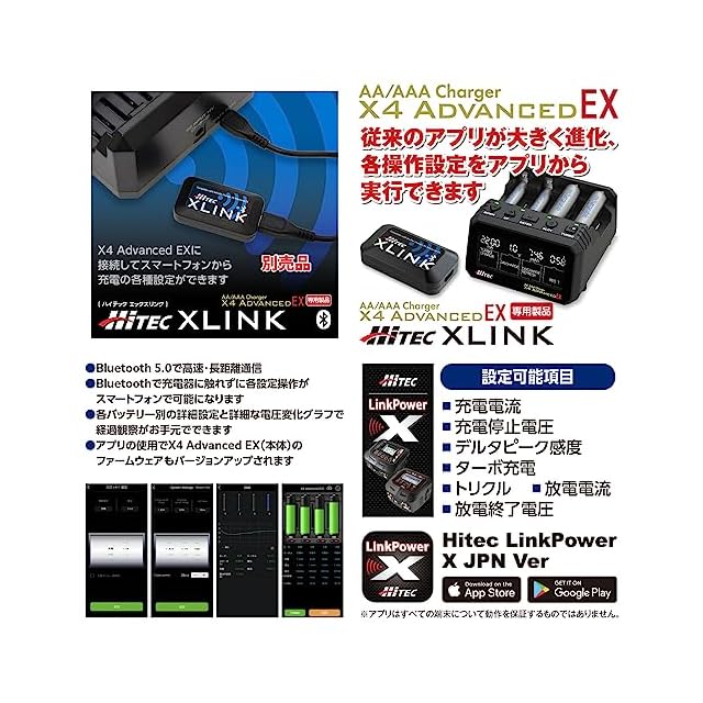 単三/単四電池用充電器 「AA/AAA Charger X4 Advanced EX」に「Hitec XLINK」を接続してアプリで充電状況が確認するだけでしたが、バージョンアップで以前のX4 Advanced3のようにスマートフォンで各種設定ができるようになりました!