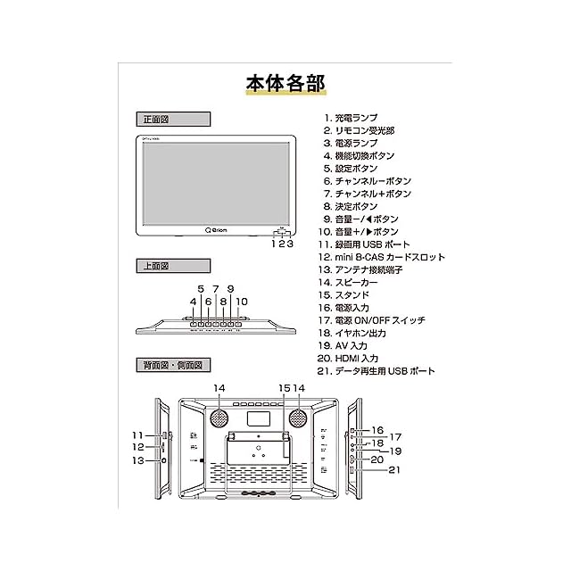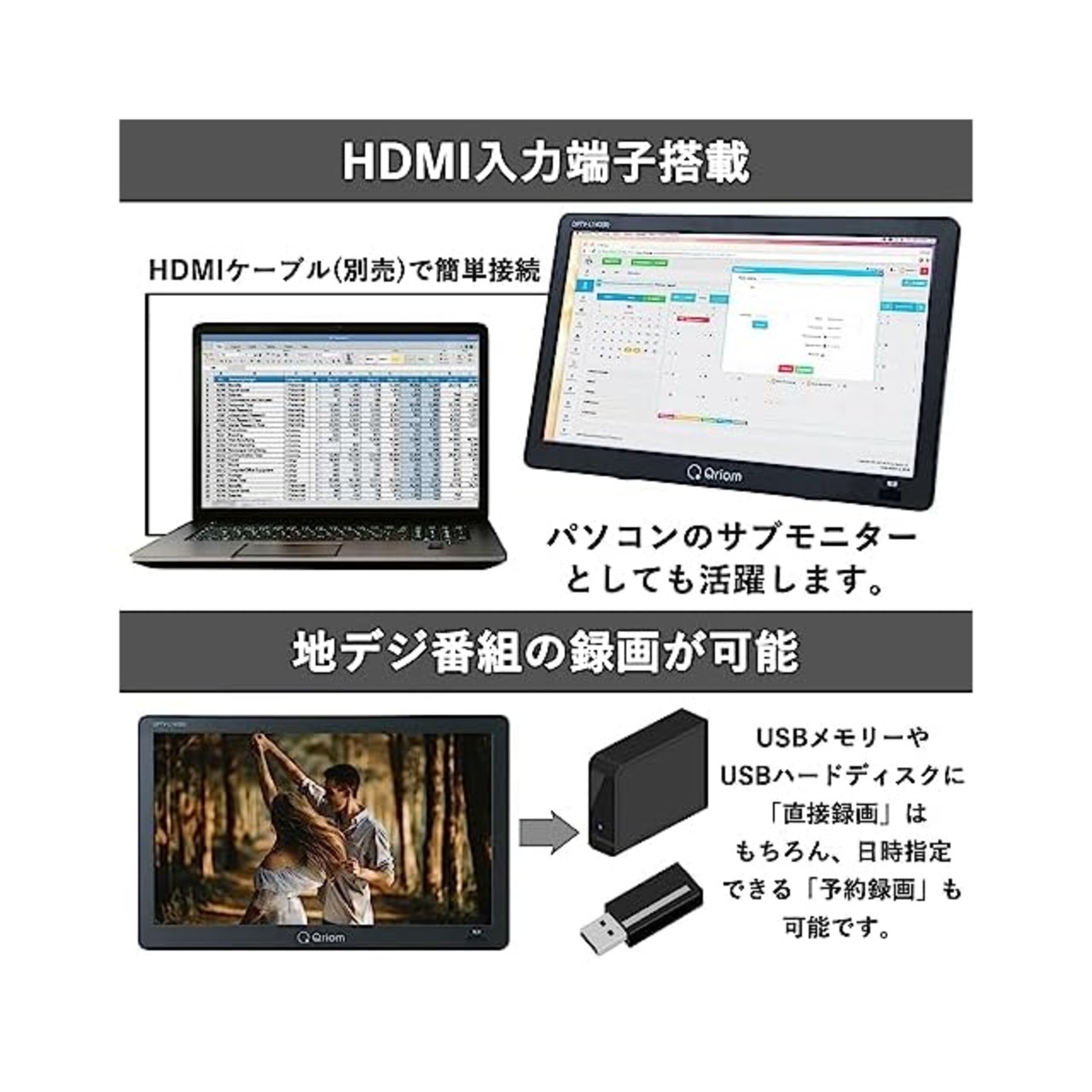【商品仕様】◇本体サイズ:幅34.4×奥行3.7×高さ21.7cm ◇本体重量:870g ◇画面サイズ:14V型 ◇アスペクト比:16:9 ◇画素数:1366×768 ◇スピーカー:2W+2W ◇受信チャンネル:地上デジタル放送/ワンセグ放送 UHF(13~62ch) ◇搭載端子:アンテナ入力端子(F型)×1、AV入力端子×1、USBポート×2(録画用×1/データ再生用×1)、HDMI端子×1、B-CASカートソケット(mini B-CASカード用)×1、ヘッドホン用3.5mm音声出力端子×1、電源入力端子×1 ◇消費電力:最大18W(満充電待機時 1W未満) ◇再生時間(バッテリー):約2時間(テレビモード) ◇充電時間(バッテリー):約3時間30分 ◇付属品:リモコン、リモコン用電池、家庭用ACアダプター、シガー電源アダプター、AVケーブル、ロッドアンテナ、mini B-CASカード、取扱説明書