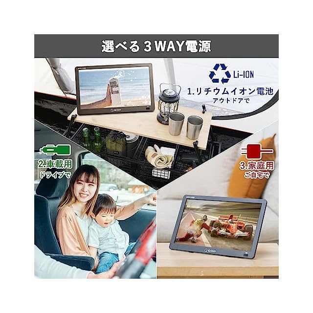 【3WAY電源】使用シーンに合わせて選べる3WAY電源(AC100V/DC12V/リチウムイオン電池)。ご自宅での使用はもちろん、旅行時の移動中はDC電源に接続、キャンプなどアウトドアでは充電してコードレスで使用など、様々なシーンで使用できます。