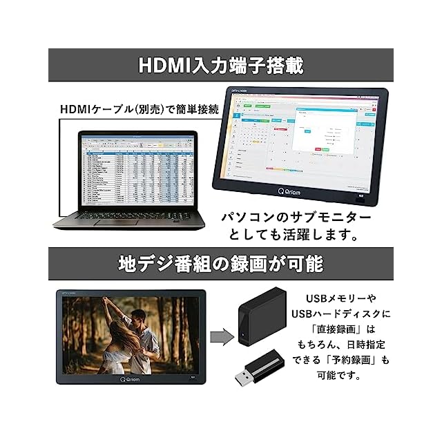 【録画機能】本機右側面のUSBポートにUSBメモリーやUSBハードディスクを接続すれば、地デジ放送を録画することができます。視聴中の番組を録画する「直接録画」はもちろん、日時指定できる「予約録画」も可能です。