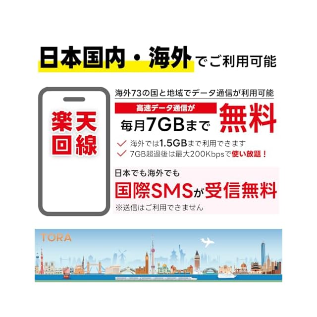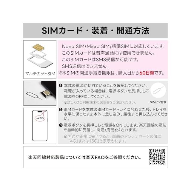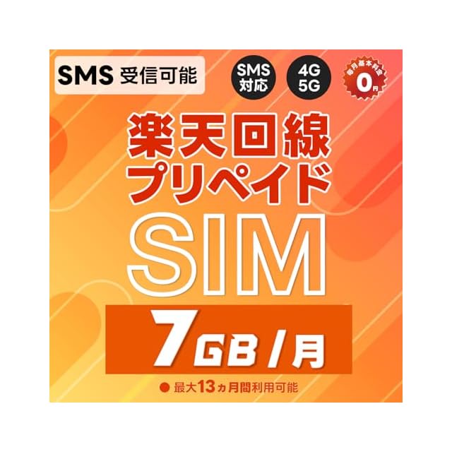 【SMS受信機能付き】LINEやInstagramやUber Eats等SMS認証が必要なアプリを簡単に登録することが可能!</br> 【SMSの利用】日本でも海外(73ヵ国)でもSMSが制限無しで受信可能。送信機能は付きません。</br> 【楽天回線】あんしんの楽天モバイル回線の高速データ通信(5G/4G)がご利用いただけます。</br> 【ギガ容量】日本国内では毎月7GBまで、海外は毎月1.5GBまで高速通信がご利用可能。超過後も200Kbpsで使い放題!</br> 【SIMサイズ】マルチカットSIMで、nanoSIM / microSIM / 標準SIM に対応しております。</br> 【かんたん利用】開通手続き、契約手続き、本人確認など一切不要!SIMカード装着で即利用可能!</br> 【APN設定不要】楽天回線に対応する端末はAPN情報自動で認識されます。</br> 【iPhone対応】iOSバージョン14.5以降で、iPhone 6S~16ProMaxに対応しています。</br> 【Android対応】Android OSバージョン10以降でご利用いただけます。</br> 【利用期間】初回通信月(初月無料特典付き)+12ヵ月(1年間)、最長13ヵ月間ご利用可能です。</br> 【有効期限】購入日からではなく、初回通信月(初月無料)から利用開始できますので、最大13カ月をむだなく利用可能!</br> 【延長利用】利用期間の延長を希望する方は、利用期限が切れる前(2か月前)までにご連絡ください。</br> 注意事項:本SIMカードでは音声通話機能はご利用いただけません。</br> 注意事項:本商品は、SIMロックフリー端末でご利用いただけます。詳しくは楽天公式サイトでもご確認可能です。</br> 注意事項:毎月の高速ギガ容量を超過後200Kbpsに低速化されますが、翌月1日に通信速度が通常に戻ります。</br> 注意事項:本SIMの開通期限(初回通信)は、購入日より60日以内となります。</br>