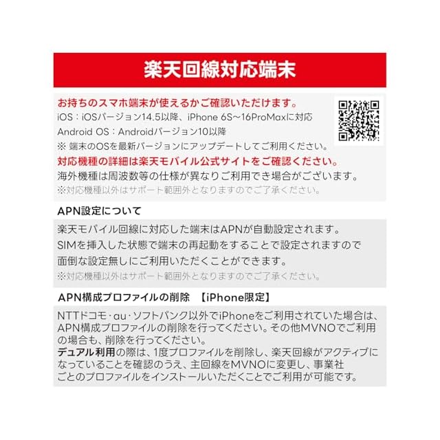 【APN設定不要】楽天回線に対応する端末はAPN情報自動で認識されます。iOSバージョン14.5以降で、iPhone 6S~16ProMaxに対応しています。Android OSバージョン10以降でご利用いただけます。