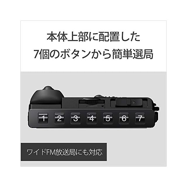 個の選局ボタンを本体上部に配置。お住まいの都道府県を選ぶだけで、選んだ地域の放送局をボタンにプリセット設定。ポケットに入れたままでも快適に選局できます。ワイドFM放送局にも対応しています。