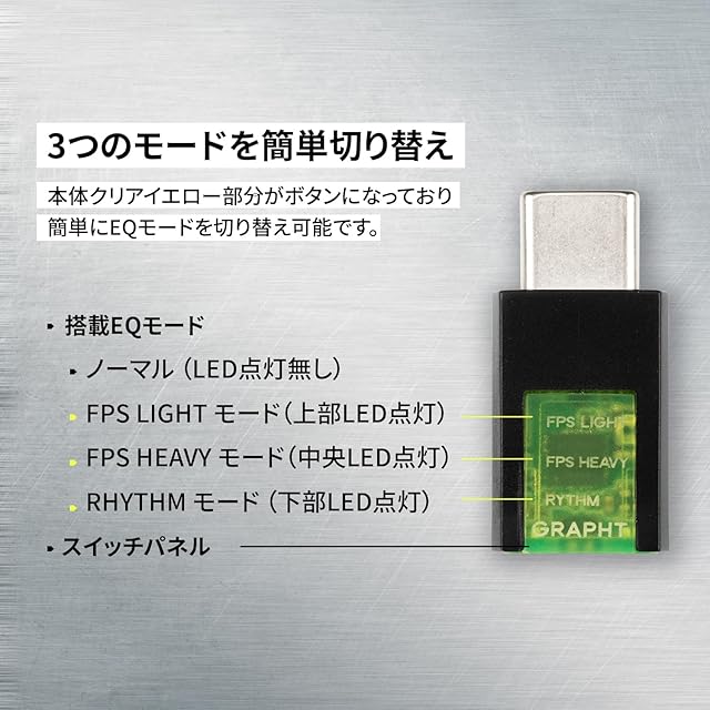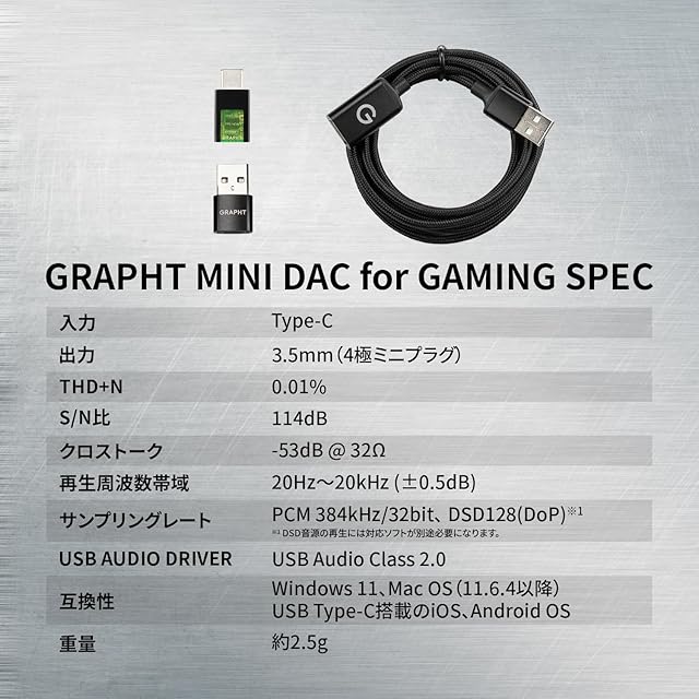 商品名:GRAPHT MINI DAC for GAMING 超小型 ゲーミングDAC 32bit/384kHz対応 ゲーミングアンプ ヘッドホンアンプ USB Type-C USB-C 3種のEQモード 音楽鑑賞 プラグアンドプレイ対応 2mUSB延長ケーブル付 USB変換アダプタ付 FPS TPS 音ゲー 音質向上 スマホ アンプ