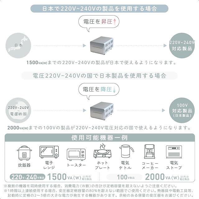 AC100V(日本国内)で1500WまでのAC220~240V仕様の家電製品が使えます。
