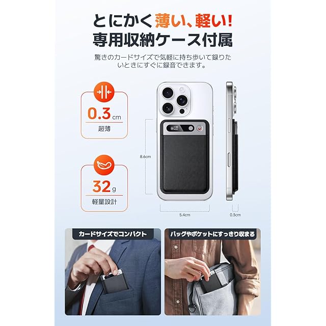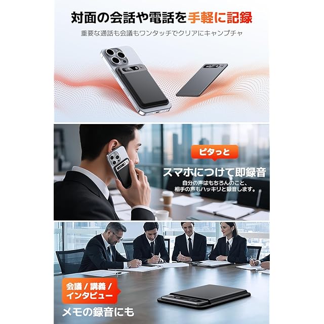✅【便利な通話録音・MagSafe対応】マグネット磁石でスマホに簡単装着できる小型ボイスレコーダー。電源スイッチを右上にスライドするだけのワンタッチ操作で、スマホの通話から自分の声と相手の声を録音できます。スマホの振動を直接キャッチする特殊なマイクで、LINEやSkype、どんな通話 アプリ でも録音できます。magsafe対応 アンドロイドなど、 マグセーフ非対応の機種も「付属の補助マグネット」をスマートフォン背面に貼り付けることで簡単に高感度、高音質な通話録音が可能 スマホケースの上からお使いいただく際も、補助マグネットを使用して電話録音が可能です。【ワンタッチ録音】録音ボタンを上にスライドするだけのシンプル簡単ワンタッチ操作でわかりやすい 。初心者、子供、お年寄り、シニア世代誰でもかんたん使いやすいのでお勧めの録音機 。