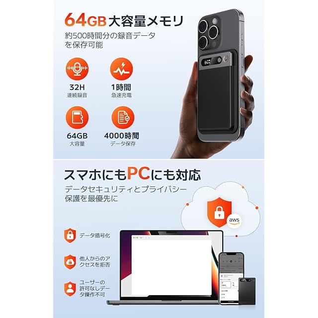✅【64GB大容量メモリー】長時間録音が可能な大容量64GBの内蔵メモリーを内蔵されており、最大約4000時間録音できます。高性能電池と省エネモード機能を搭載し、満充電の状態で最大35時間連続録音可能です。【保存容量は無制限】オートメモクラウドに自動で保存され、容量を気にせず録音できます。クラウドへの保存はWi-Fi接続が必要です。【安心できるデータ保護機能】データ保護機能が付いており、万が一電源が切れた場合は自動的に録音内容保存し、録音ファイルを紛失することに心配必要ありません。