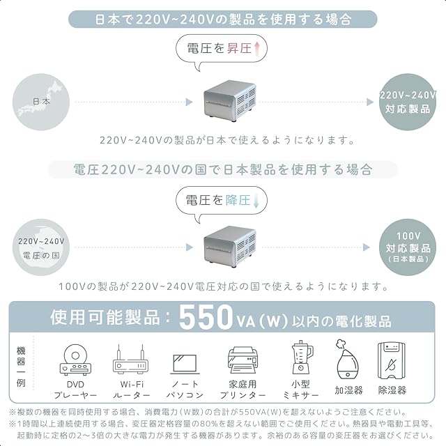 AC100V(日本国内)で550WまでのAC220~240V仕様の家電製品が使えます。