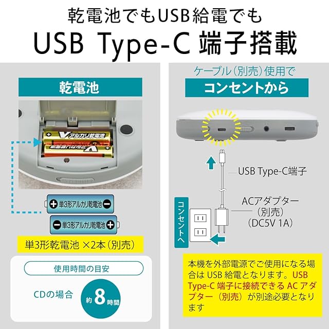 【 仕 様 】 ◆電源:DC3V 単3形乾電池(LR6)×2本(別売) ◆外部電源:DC5V 1A、USB給電…USB Type-C端子(ACアダプター別売) ◆音声出力端子:ヘッドホン出力(φ3.5mmステレオミニジャック)、実用最大出力 15mW+15mW(32Ω) ◆対応フォーマット:CD-DA、MP3(CD、CD-R、CD-RWディスク対応)