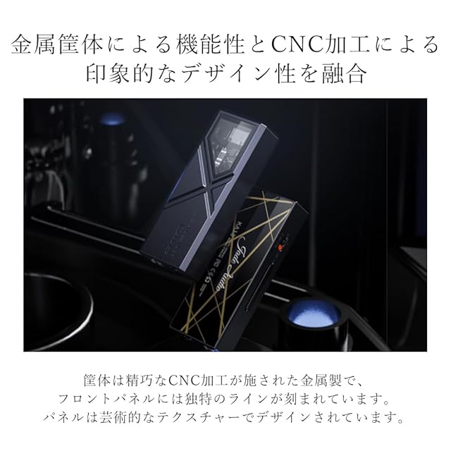 金属筐体による機能性とCNC加工による印象的なデザイン性を融合:筐体は精巧なCNC加工が施された金属製で、フロントパネルには独特のラインが刻まれています。 パネルは芸術的なテクスチャーでデザインされており、ソフトな印象与えつつも、テクノロジーのタフで新しいビジョンを与えています。 持つたびに繊細で心地よい感触を与え、日常の音楽ライフをより豊かなものへと導きます。