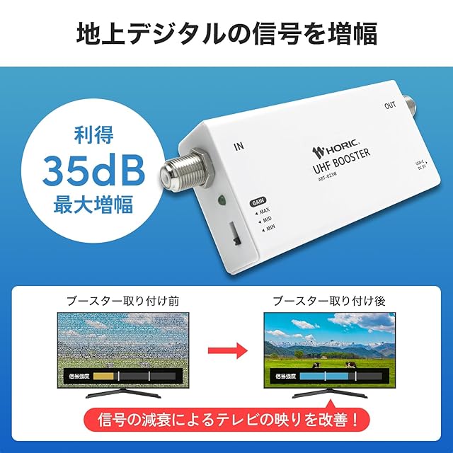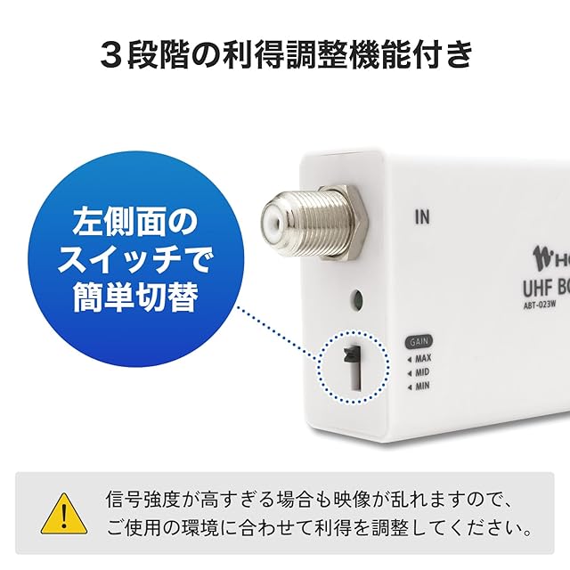 ●周波数帯域:470~710MHz ●利得:10~35dB ●利得調整範囲 ・MAX:25~35dB ・MID:15~25dB ・MIN:10~15dB