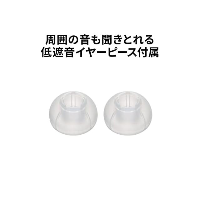 遮音性に優れた標準イヤーピースに加え、ジョギングなど屋外で使用する際の安全性に配慮し、周囲の音が聞こえやすい低遮音イヤーピースも付属(各3サイズ)。テレワーク時やオンライン会議での通話に使用する際にも、周囲の音が聞き取りやすく便利。