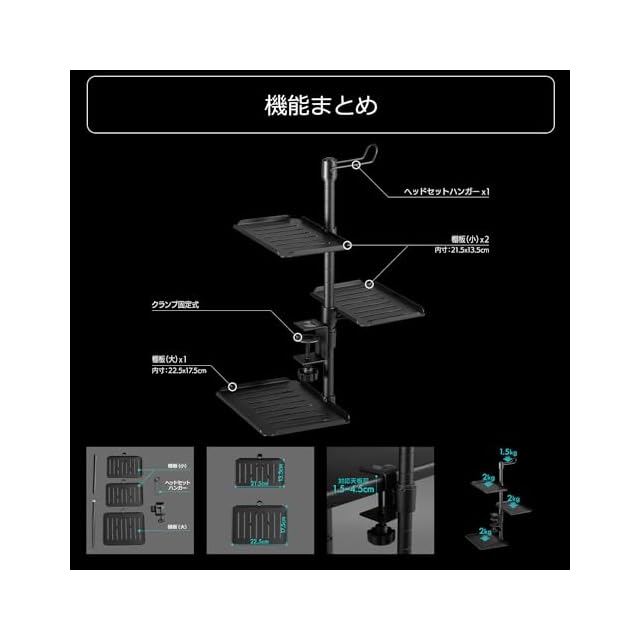 【収納パーツ】棚板(小)×2、棚板(大)×1、ヘッドセットハンガー×1の計4つが付属します。棚板はスマホやペン立てなどの小物収納にも便利です。