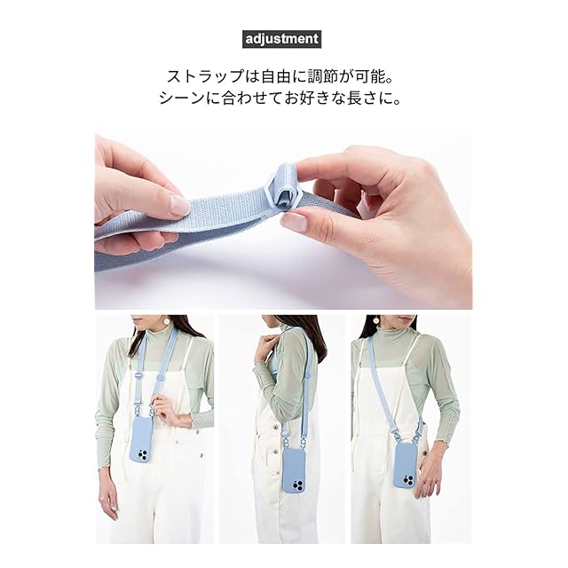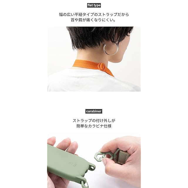 ケースとストラップのセット / ストラップの長さは自由に調節が可能 / 首や肩に食い込みにくい平紐のストラップ / オリジナルデザインのカラビナでストラップの付け外しが簡単 / ライトニングコネクタに干渉しないため、スマホケースを付けたまま充電が可能