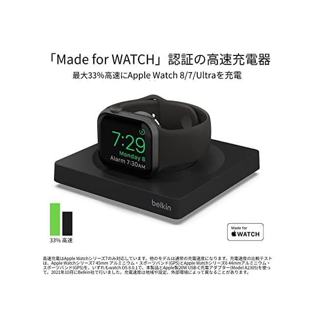 【Apple Watch Series 7/8/9/Ultraの充電を最大33%速くなる】この充電パッドには新開発の磁気式急速充電モジュールを採用し、約45分で0~80%の急速充電が可能です*。